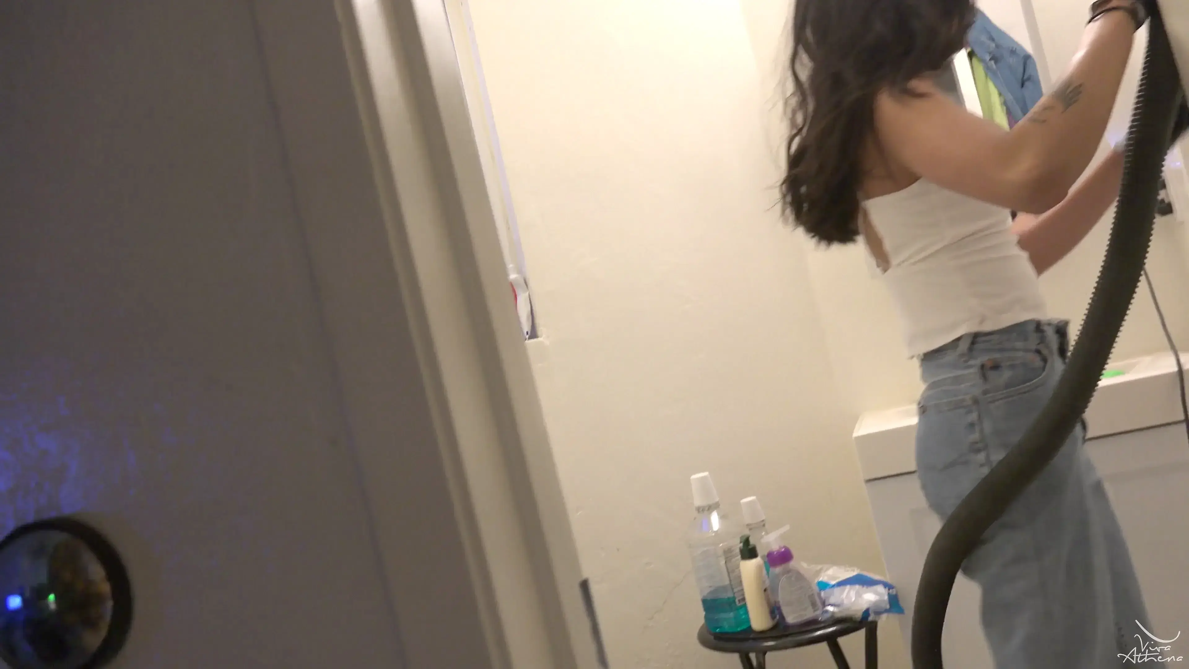 Bombshell Desi Girl Vacuuming the Bathroom in Crop Top and Jeans
